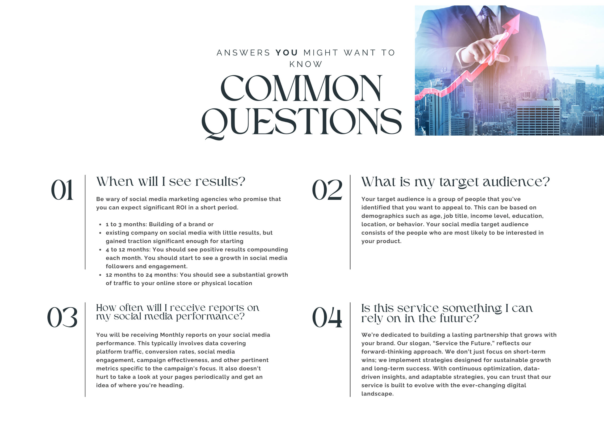 Content Creation: We design captivating visuals and craft compelling post that resonate with your brand and boost engagement.Content Scheduling: Strategically planning and scheduling posts, to keep your feed active and consistent with your overall strategy.Community Management: We engage with your audience, turning followers into loyal customers by responding to every comment with care.Strategy Development: Building data-driven social media strategies that drive growth and increase conversions to sales.Analytics & Reporting: Our team analyzes performance metrics and provides insights to continually optimize your social media success.Ad Campaign Management: We create and manage ad campaigns designed to maximize reach and conversion, ensuring every dollar counts. (Contact us for pricing and terms.)Social Listening: Success for our clients and their target audience comes with monitoring audience conversations to identify trends and opportunities, keeping your brand ahead of the competition.
